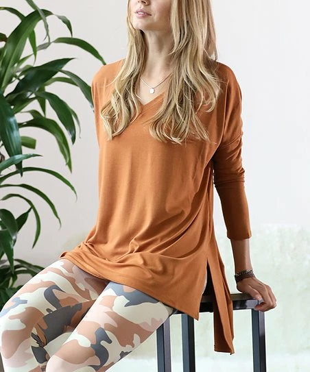 A hi-low hem brings flowy coverage to this long-sleeved dolman top made from stretch-enhanced fabric.