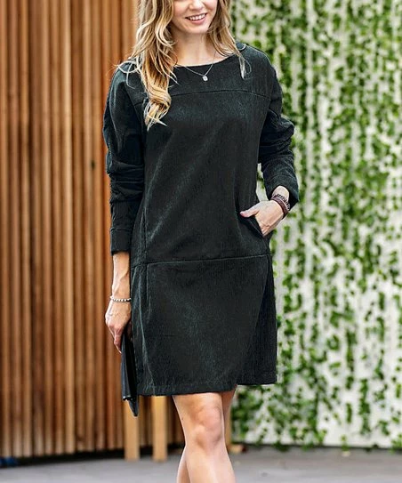 42POPS | Black Corduroy Boatneck Long-Sleeve Pocket Shift Dress – Women