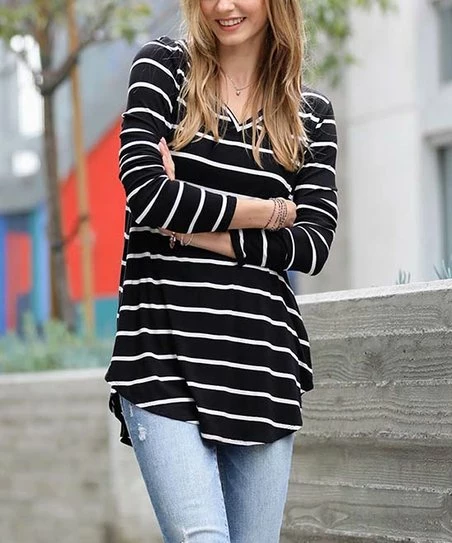 Stripes bring a classic look to this long-sleeve v-neck top showing off a dolphin hem.