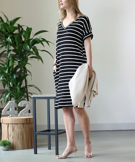 A roomy shift dress featuring rolled short sleeves and functional side-hit pockets. Finished with a horizontal stripe print.