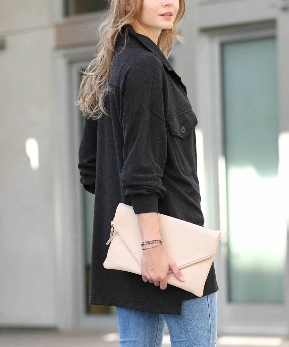 Add a lightweight layer to your look with this oversize shacket featuring pockets and a button-up front.