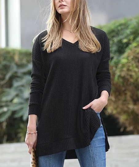 Easy-to-pair tunic with a relaxed fit and long sleeves. Soft thermal waffle-knit construction with a structured v-neckline.