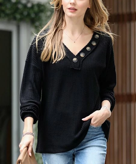 Asymmetrical button accents add a poised finish to the v-neckline of this cozy waffle sweater.