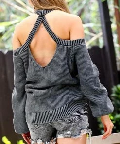 Sunshine-ready cold-shoudler top featuring a halter neckline and chic washed tone.