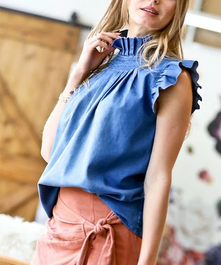 Chic denim top with a ruffled mock neck and short flutter sleeves. Gathered yoke detail lends a flattering finish.