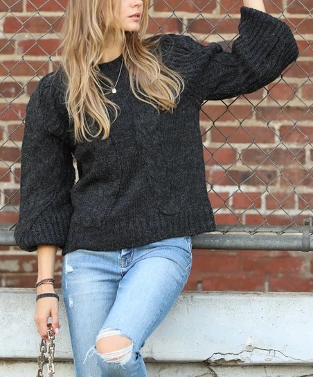 A cable knit design brings timeless style to this sweater featuring trendy balloon sleeves.