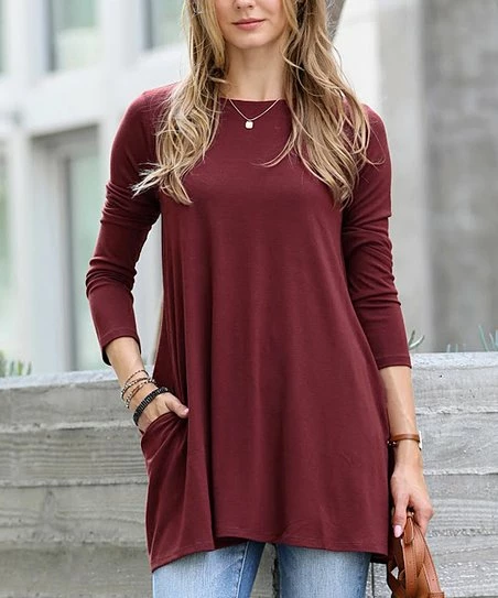 Loose-fit tunic made with a hint of stretch and front pockets. A boat neckline and long sleeves.