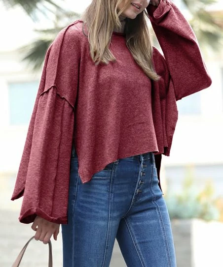 Go for a relaxed look in this mock neck sweater featuring flowy long sleeves and a draping side-slit hem.