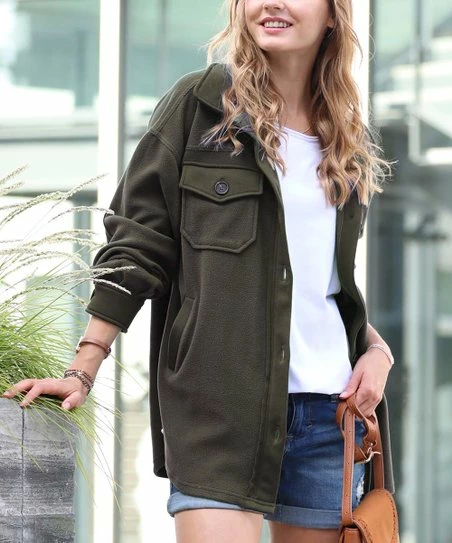 Fend off chilly weather in this warm fleece shacket featuring rugged elbow patches and handy side pockets.