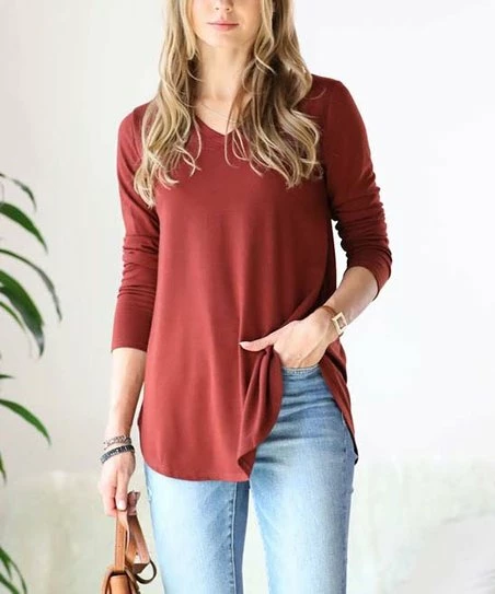 Long-sleeve top featuring a flattering v-neckline and graceful curved hem.