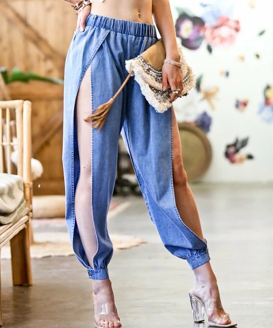 Enjoy wearing these washed-out denim joggers that feature deep side slits for an edgy look on a night out.