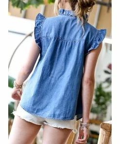 Think cool thoughts in this denim button-up top framed by fluttery sleeves. A ruffle pretties up the v-neck and placket.