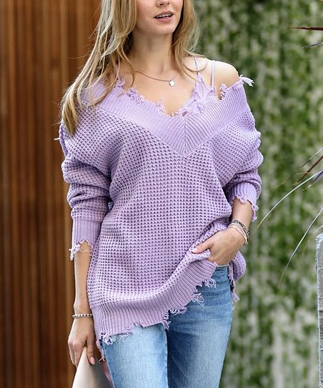 Raw edges at the hem and neckline add a fringed effect to this slouchy waffle-knit sweater. Wide double v-neck.