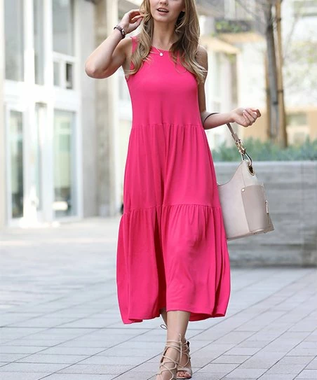 Two gathered tiers fall from the waist of this sleeveless midi dress featuring stretchy fabric and a flowy silhouette.
