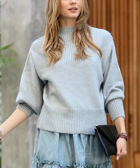 Coziness is key in this sweater featuring long puff sleeves and a mock neckline to keep you covered.
