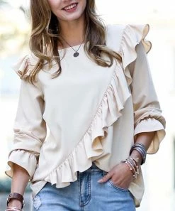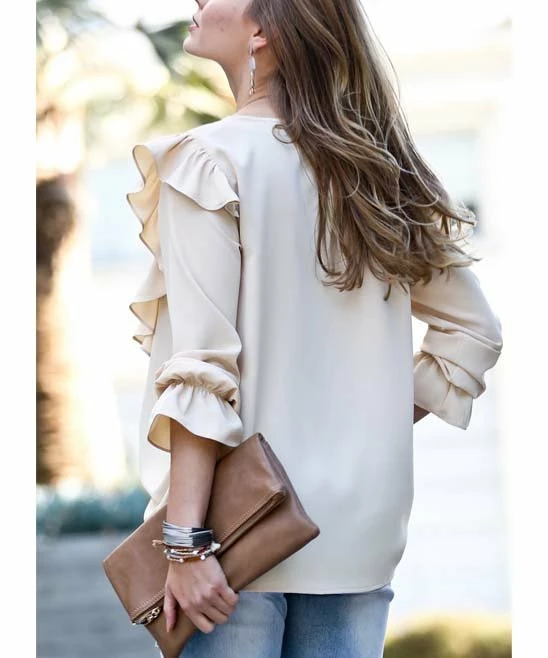 Lightweight top featuring ruffle accenting and dramatic puff sleeves.