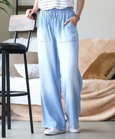 Go for casually trendy style in these flowy wide-leg chambray pants featuring spacious side pockets and an adjustable drawstring waist.