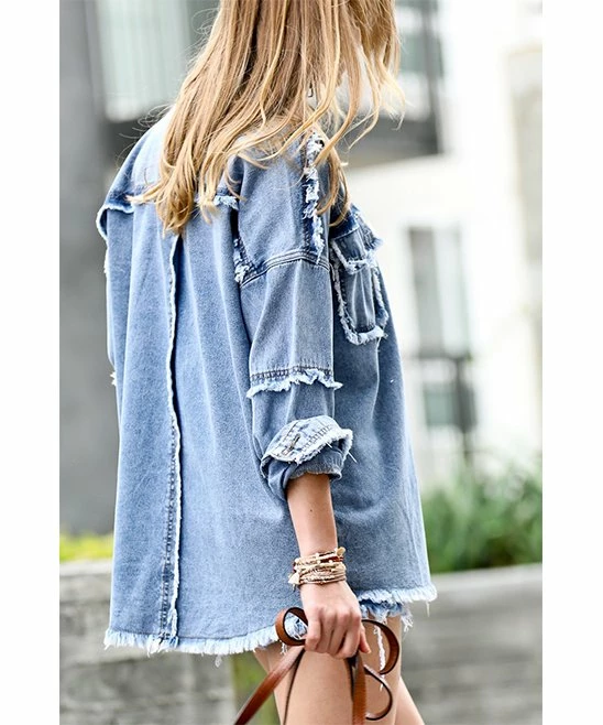 Level up your casual looks when you layer with this chic denim jacket that features fringe-hem details.
