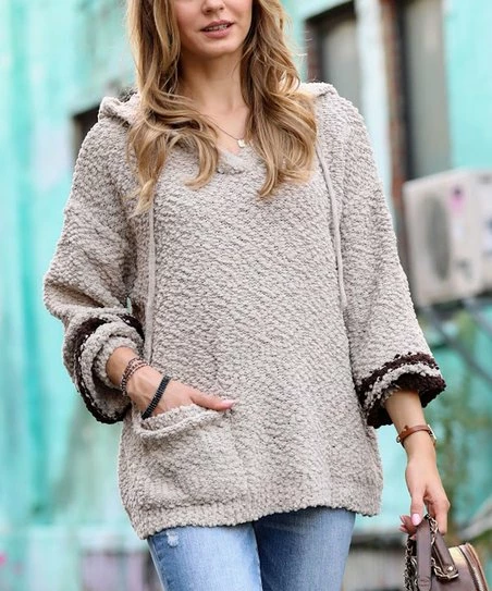 A thick popcorn knit brings a cushy feel to this hooded oversize sweater showing off front pockets and stripes at the wrist.