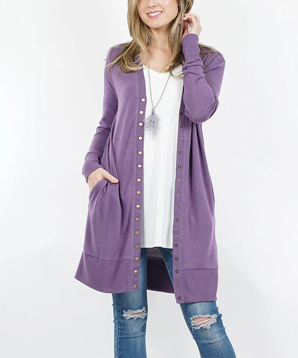 Cardigan featuring stretch-infused fabric and a snap-button design so you can wear it open or closed.
