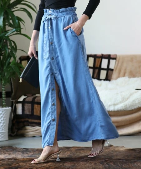 This chambray ankle-length skirt features a paper-bag waist and handy pockets.