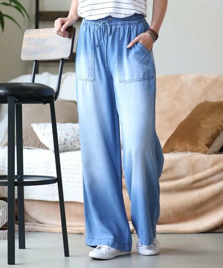 Go for casually trendy style in these flowy wide-leg chambray pants featuring spacious side pockets and an adjustable drawstring waist.