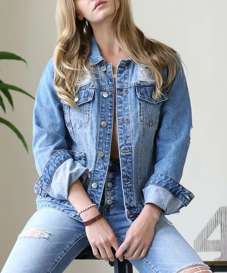 Top off your ensemble with this denim jacket featuring breathable cotton material and classic distressed detail.