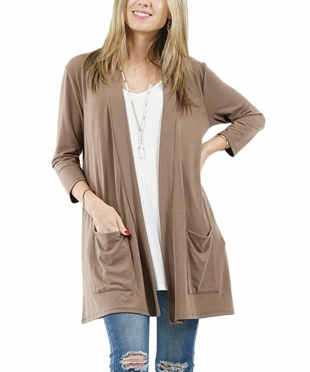 This soft and slouchy cardigan has two patch pockets and an open front. Finished with three-quarter length sleeves.