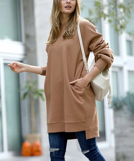 42POPS | Mocha Relaxed-Fit Crewneck Longline Pocket Sweatshirt – Women