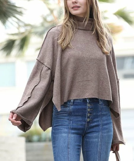42POPS | Mocha Side-Slit Mock Neck Drop-Shoulder Hi-Low Sweater – Women