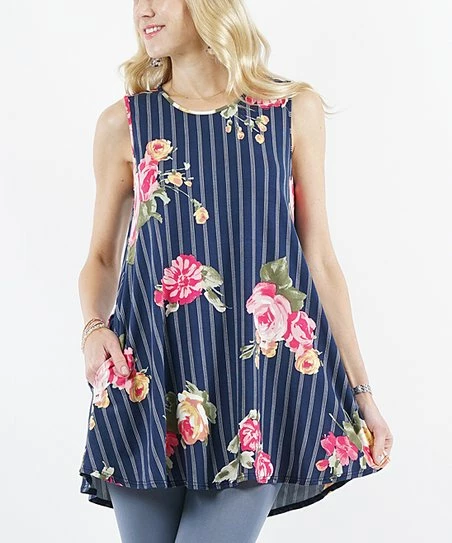 Add to your casual wardrobe essentials with this lightweight, stretchy swing top that features a vibrant pattern and side pockets for added convenience.
