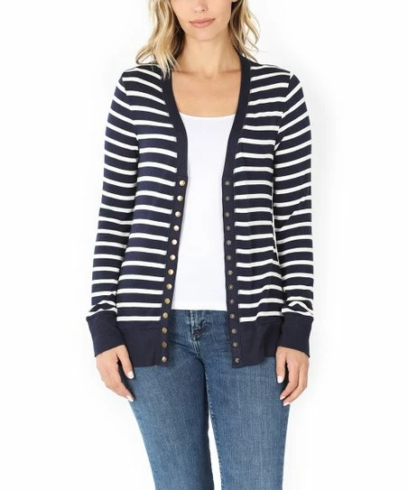 Classic stripes decorate this lightweight cardigan that has an easy snap-up front.