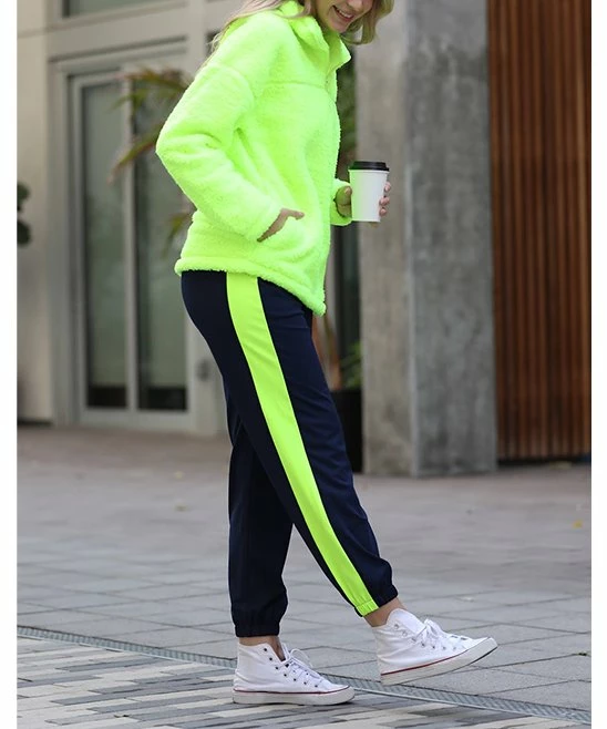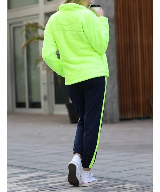 - Includes neon lime Sherpa zip-front pullover and black and neon lime stripe sweatpants (two pieces total)