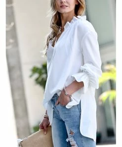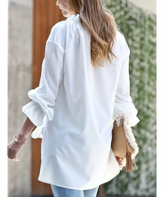 Puff-sleeve top featuring elegant ruffle accents and stretch-infused fabric.