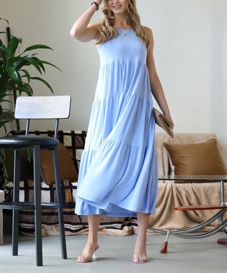 Three gathered tiers fall from the waist of this sleeveless midi dress featuring stretchy fabric and a flowy silhouette.