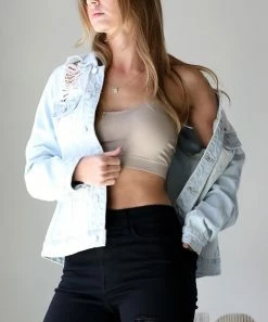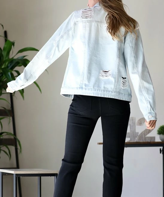 Top off your ensemble with this denim jacket featuring breathable cotton material and classic distressed detail.