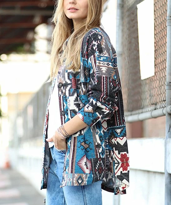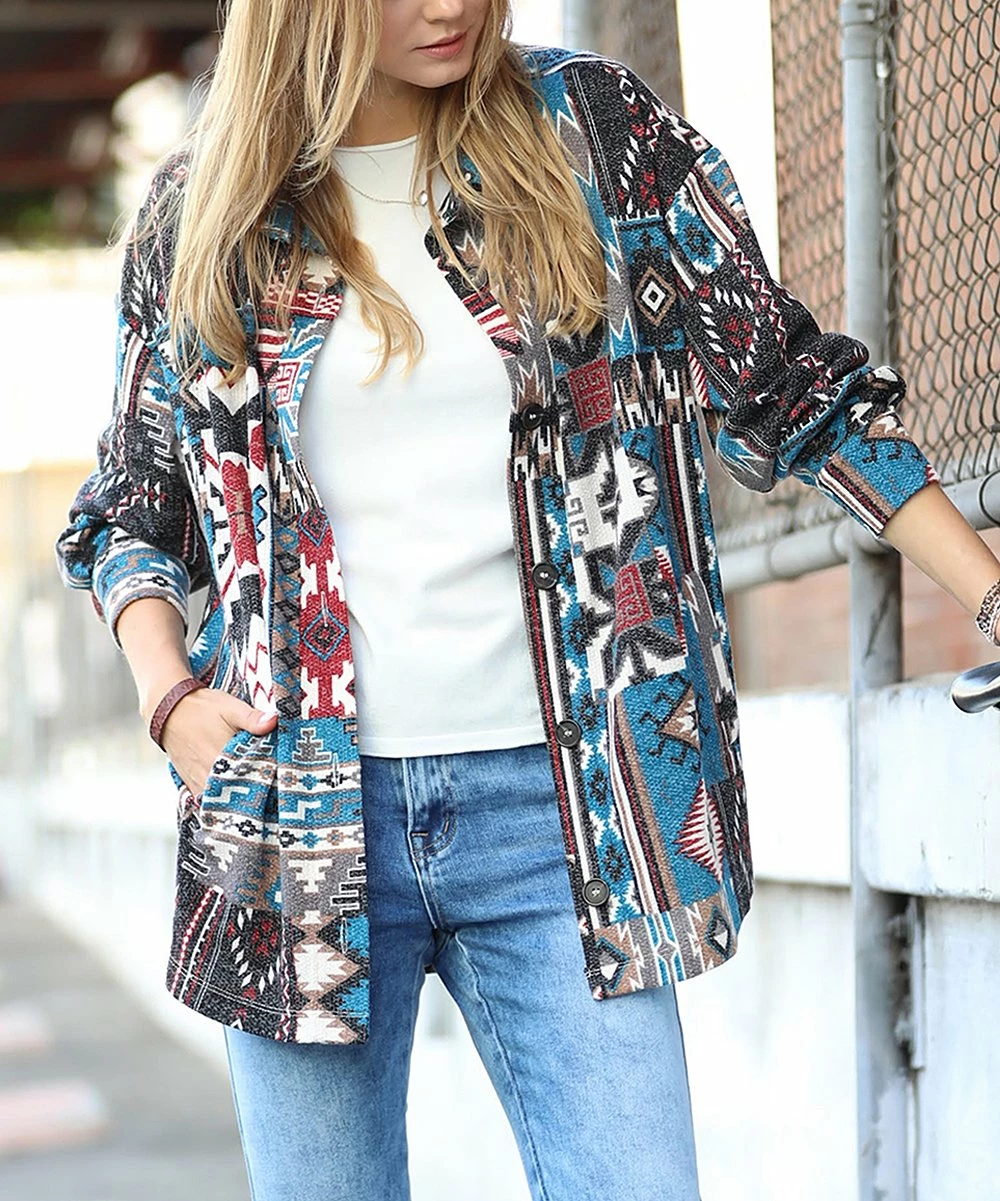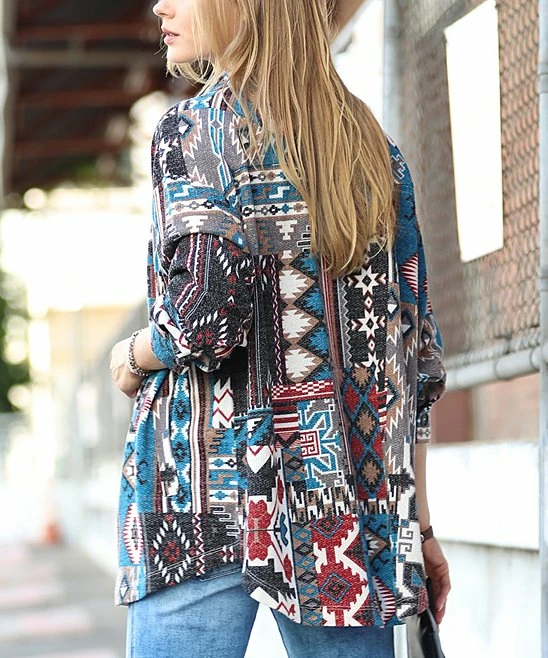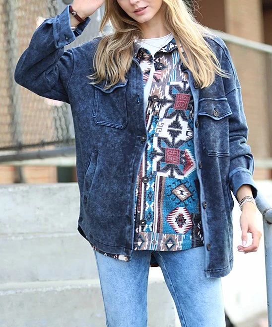 Layer up in this oversize shacket that has a geometric print and side pockets.