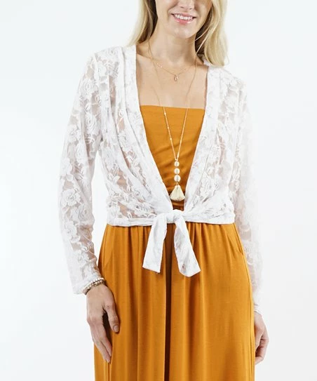 Accent ensembles with sheer, lacy details when you layer with this long-sleeve bolero that ties off at the front for a